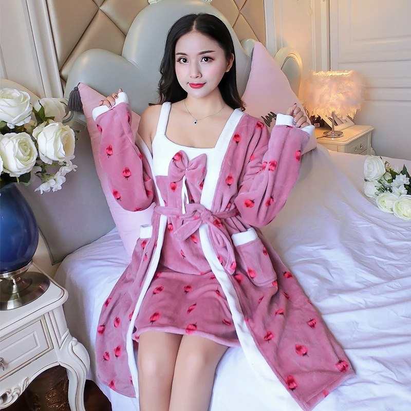 BEST QUALITY 2 Pcs Warm Flannel Robe 2019 Winter Floral Robe Thicken Nightgowns Bathrobe Women Pajamas Bath Flan