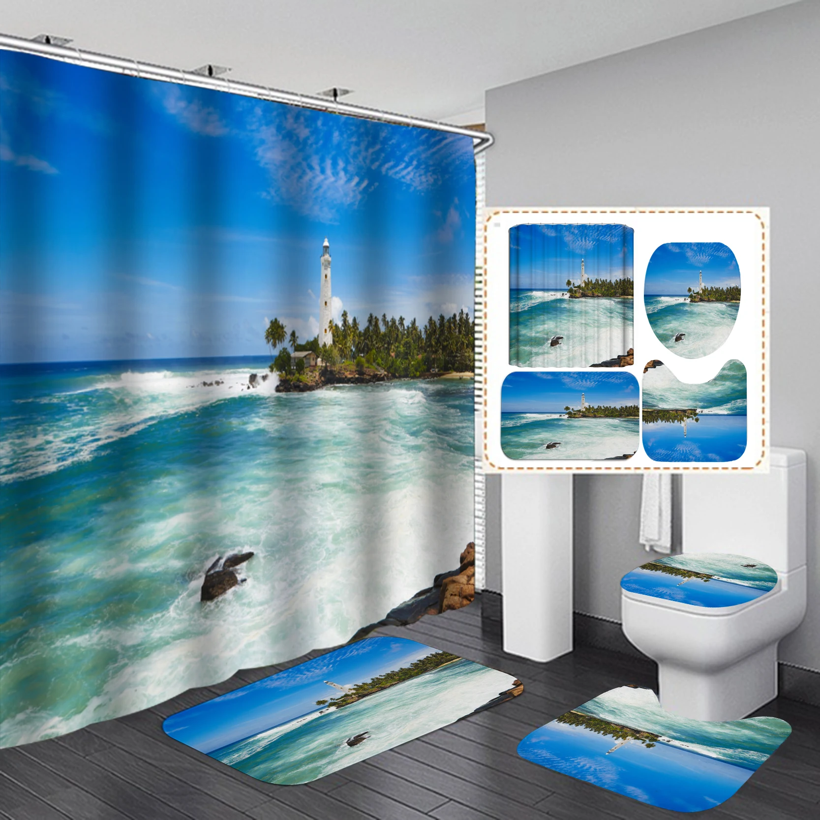 Coastal Beach Scenery Printed Pattern Shower Curtain Pedestal Rug Lid Toilet Cover Mat Bath Mat Set