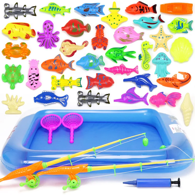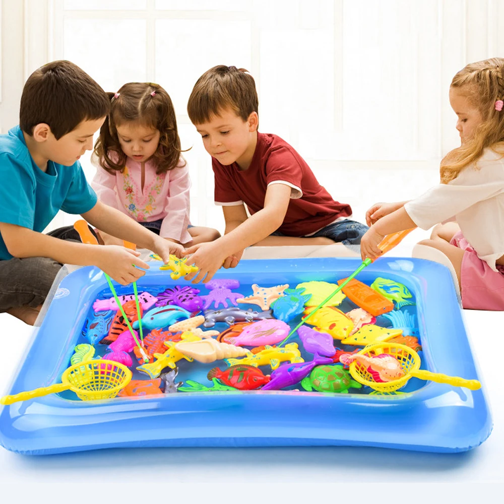 18-52pcs Baby Fishing Toys Inflatable Fishing Pool + Basket+Rod Magnetic Fishing Set Kids Indoor Ou